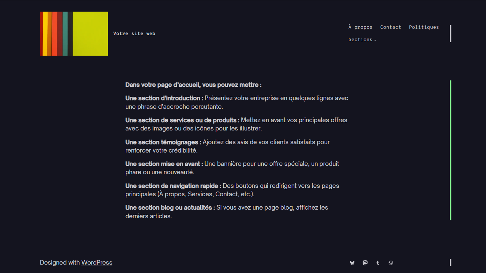 Vous obtenez un site complet avec 5 pages (Accueil, À propos, Contact, Politiques + une page selon votre activité). Vous me fournissez vos textes et images, et je les intègre dans le site à votre place.